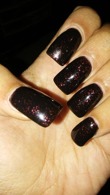 The whole procedure took a good 2 hours. Probably the most time I have ever spent getting my nails done. The style I received was a stiletto shape in a gel powder full set. The polish was completed using the Gelish polish companies 406 for a base and 470 sparkle topcoat. While both colors were complemented beautifully together, the manicurist only did two layers of the 406 on all nails except the right thumb nail. That nail received 3 coats. It makes my nail color look uneven, I do like the color that 3rd coat left. All nails are still beautifully done though. The shape is accurately filed and curved.